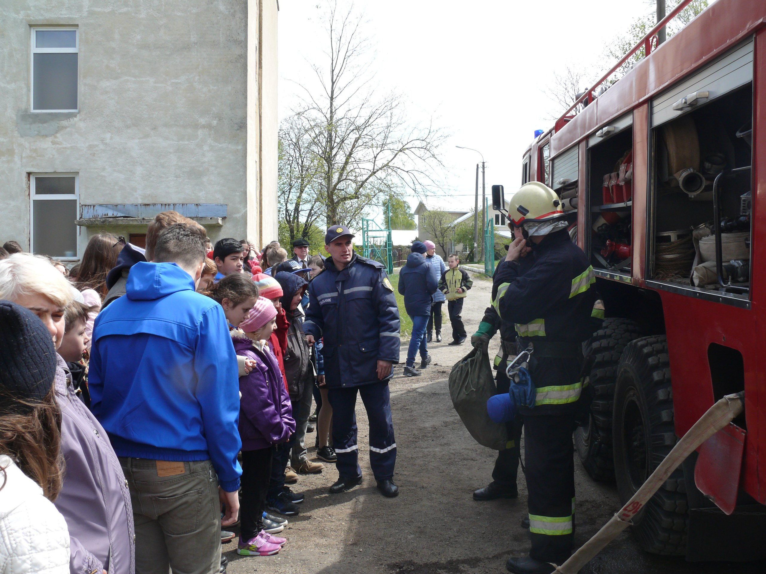 Завершальним етапом навчально-практичного дня була евакуація школи, де учні і вчителі продемонстрували обізнаність і підготовку з цивільного захисту населення на випадок надзвичайних ситуацій. Перед евакуацією директор школи Володимир Драган зателефонував до пожежної частини і повідомив про «задимлення» в одному з кабінетів школи. Опісля голосно прозвучав сигнал тривоги і вчителі організовано вивели своїх учнів із класу на подвір’я школи, де було строго перевірено кількість учнів, які вийшли. У дворі школи, зреагувавши на виклик директора, вже стояв спец автомобіль ДПРЧ-6 із пожежно-рятувальною бригадою. Пан Володимир в присутності начальника ДПРЧ-6 МВ ГУ ДСНС України у Львівській області старшого лейтенанта служби цивільного захисту Андрія Блонара заявив, що школа вклалася в норматив і готова то активних дій під час надзвичайних ситуацій. Після цього старший лейтенант Блонар зібрав учнів середньої та старшої школи біля пожежної машини і разом із керівником 2-го відділення ДПРЧ-6 старшим лейтенантом Степаном Кульганом та його групою рятувальників розповіли про функціональність спец автомобіля, а також продемонстрували як користуватися пожежним рукавом, гасіння водою та піною, яке «обмундирування» одягають на себе рятувальники (теплозахисні костюми та систему AUER для забезпечення дихання в задимлених приміщеннях). Особливі радість та захват в учнів викликала можливість посидіти в пожежній машині, де дружелюбний водій пояснював усім зацікавленим про управління та систему оповіщення.
